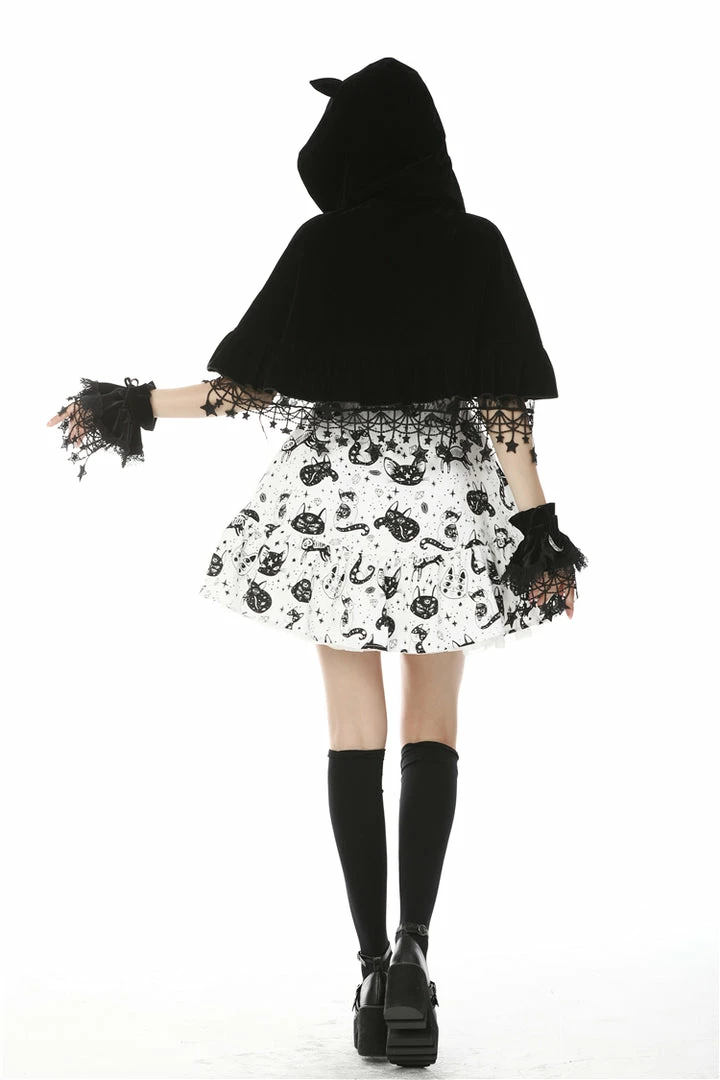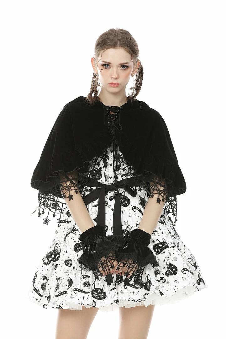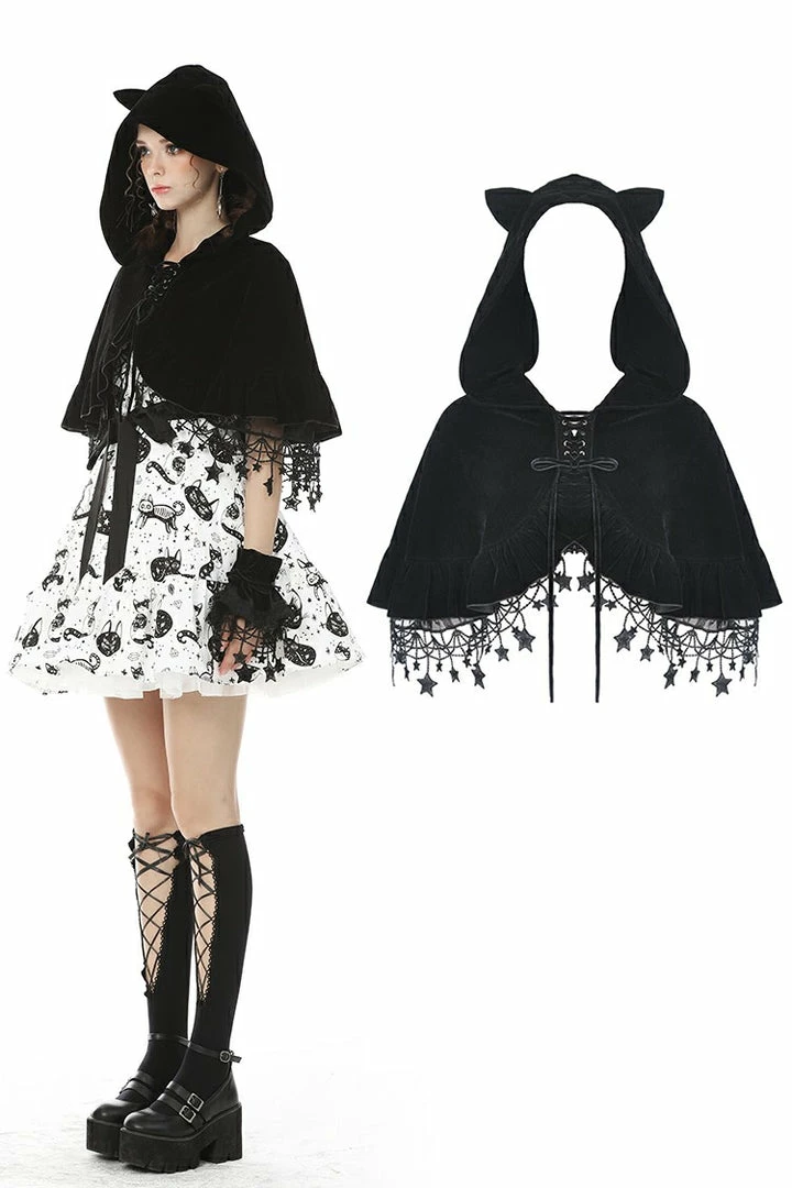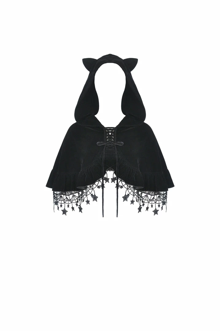 - Elevate your wardrobe with the Dark In Love Star Cat Velvet Hooded Cape. This luxurious velvet cape is designed for women who appreciate elegance and unique fashion statements.