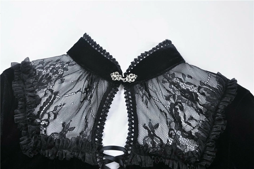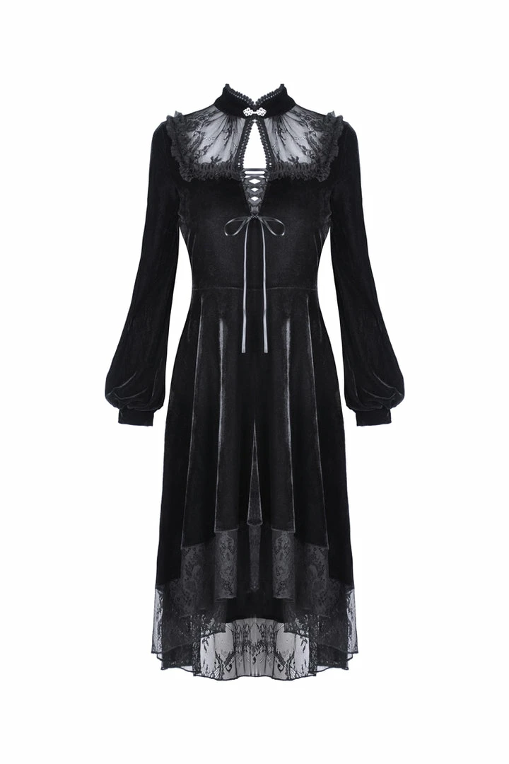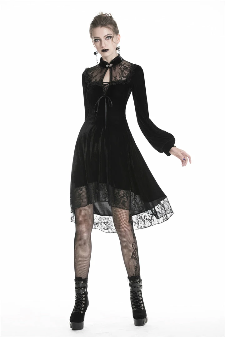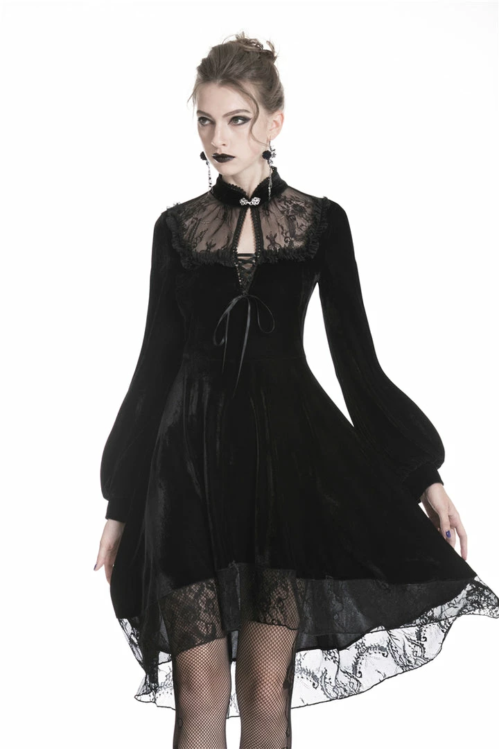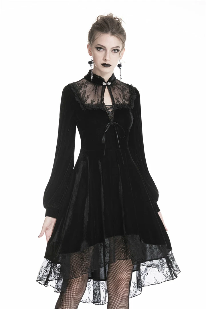 This stunning velvet dress from Dark in Love features a high collar with ornate hook and eye closure, lace panel on the chest with ruffled lace edging and corset-inspired ribbon lacing, long sleeves with narrow cuffs and flared high low skirt with lace trim.