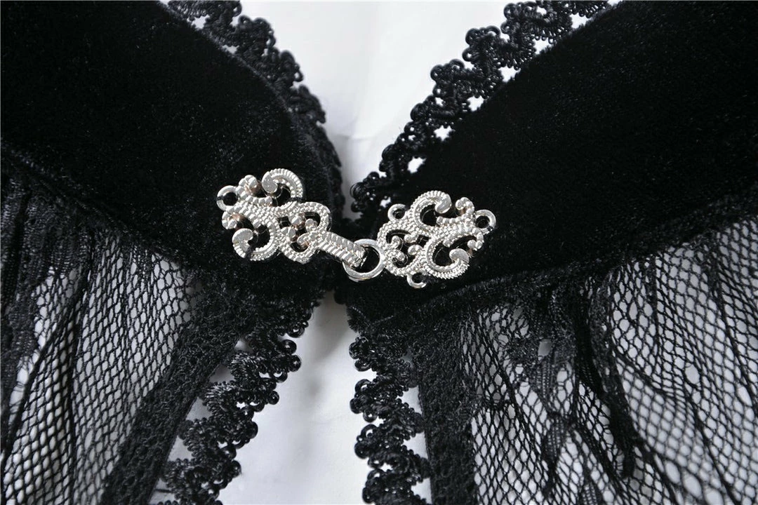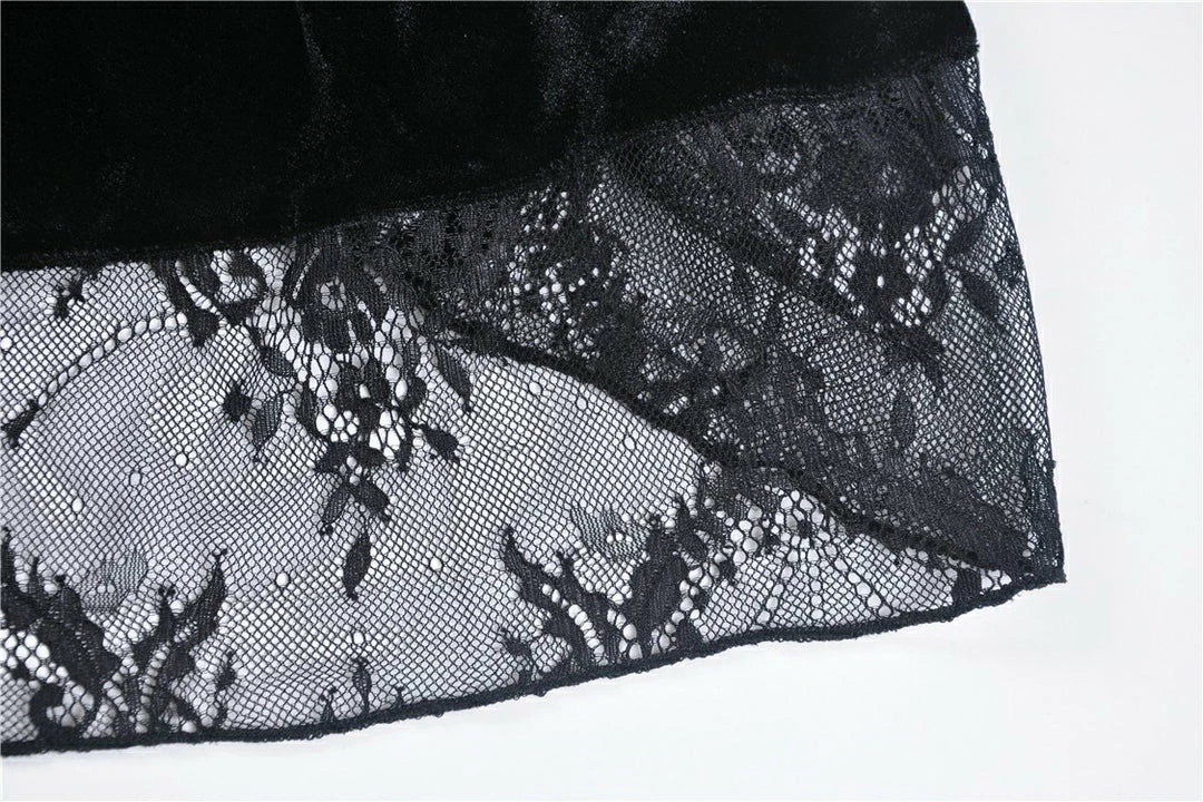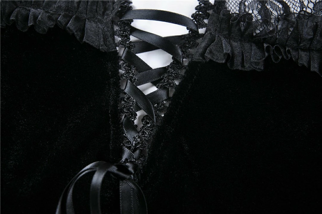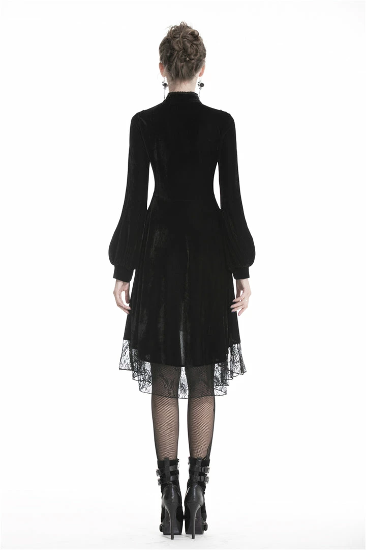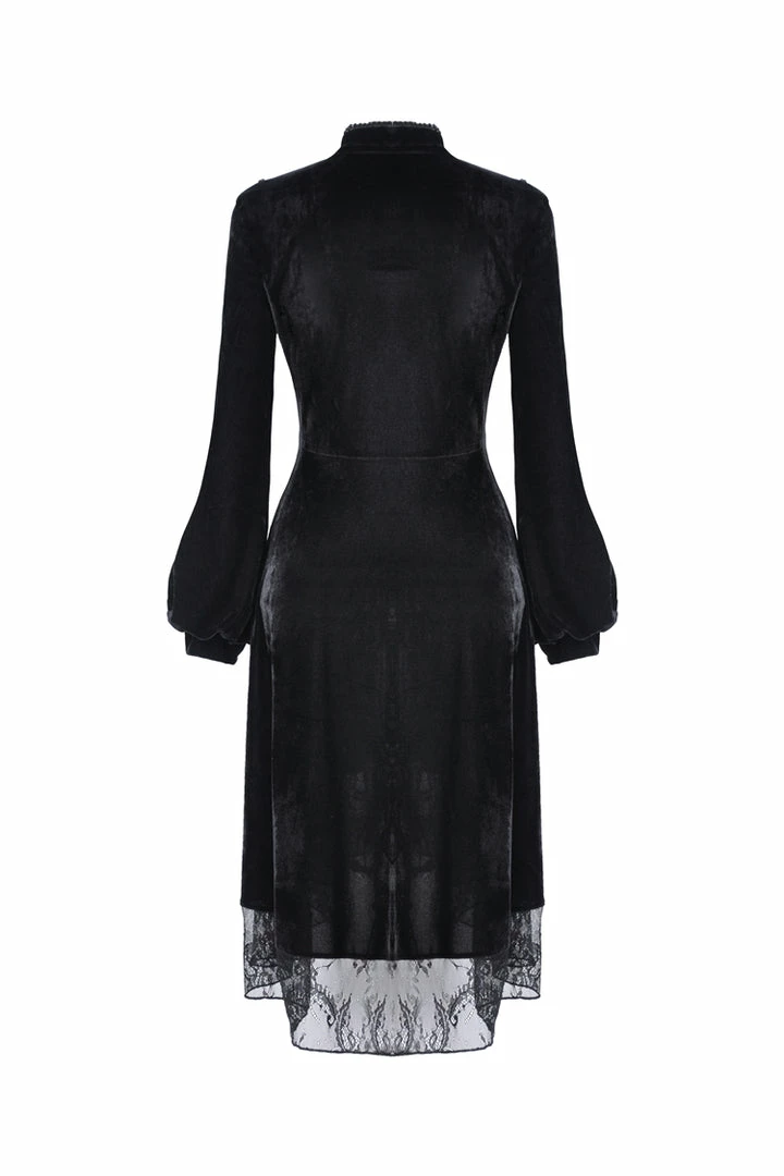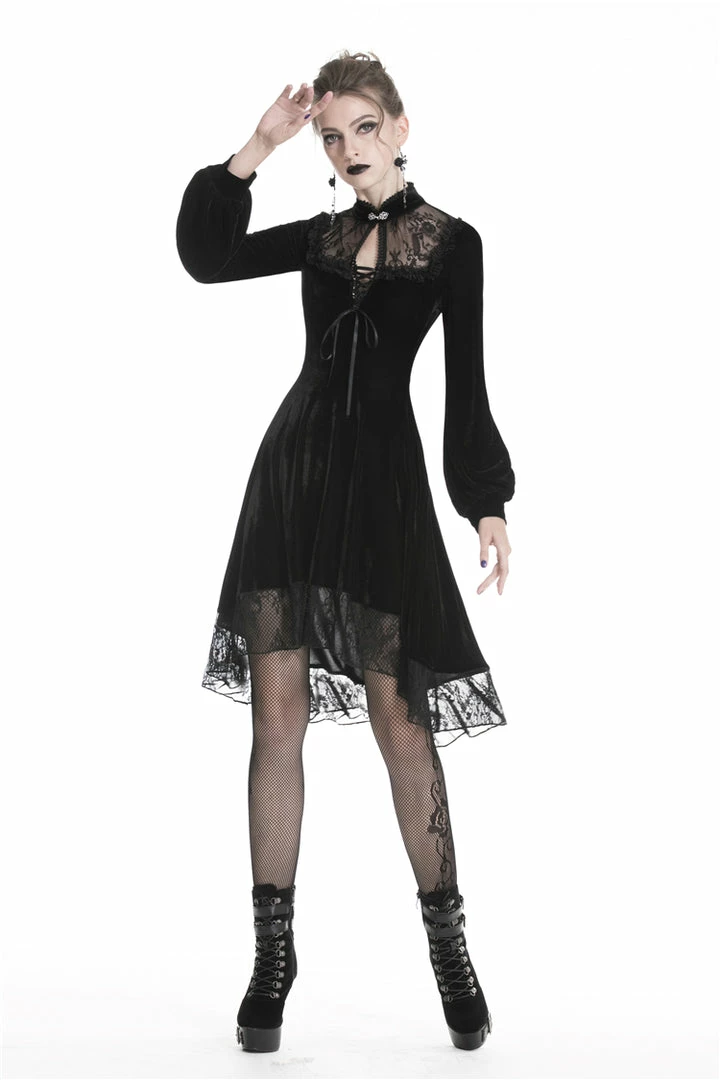 This stunning velvet dress from Dark in Love features a high collar with ornate hook and eye closure, lace panel on the chest with ruffled lace edging and corset-inspired ribbon lacing, long sleeves with narrow cuffs and flared high low skirt with lace trim.