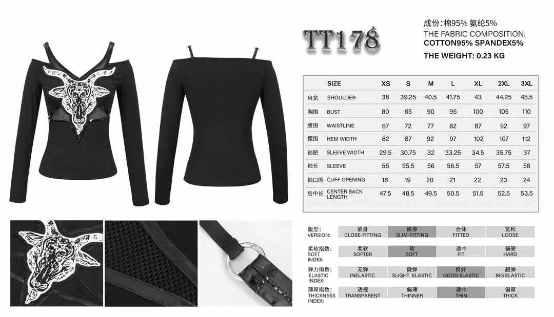 Amazing black long sleeved top from Devil Fashion featuring cutout styling with white contrast Baphomet print. This stunning top is made from a stretchy lightweight cotton fabric that is fitted to show off your curves. This edgy black top features cold shoulders, mesh panels and pentagram detailing for a stand out style that looks amazing whatever you pair it with!