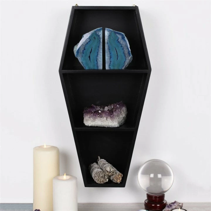 - Enhance your home decor with our Gothic Coffin Display Shelf. Perfect for showcasing your favorite Gothic collectibles, books, or memorabilia.
