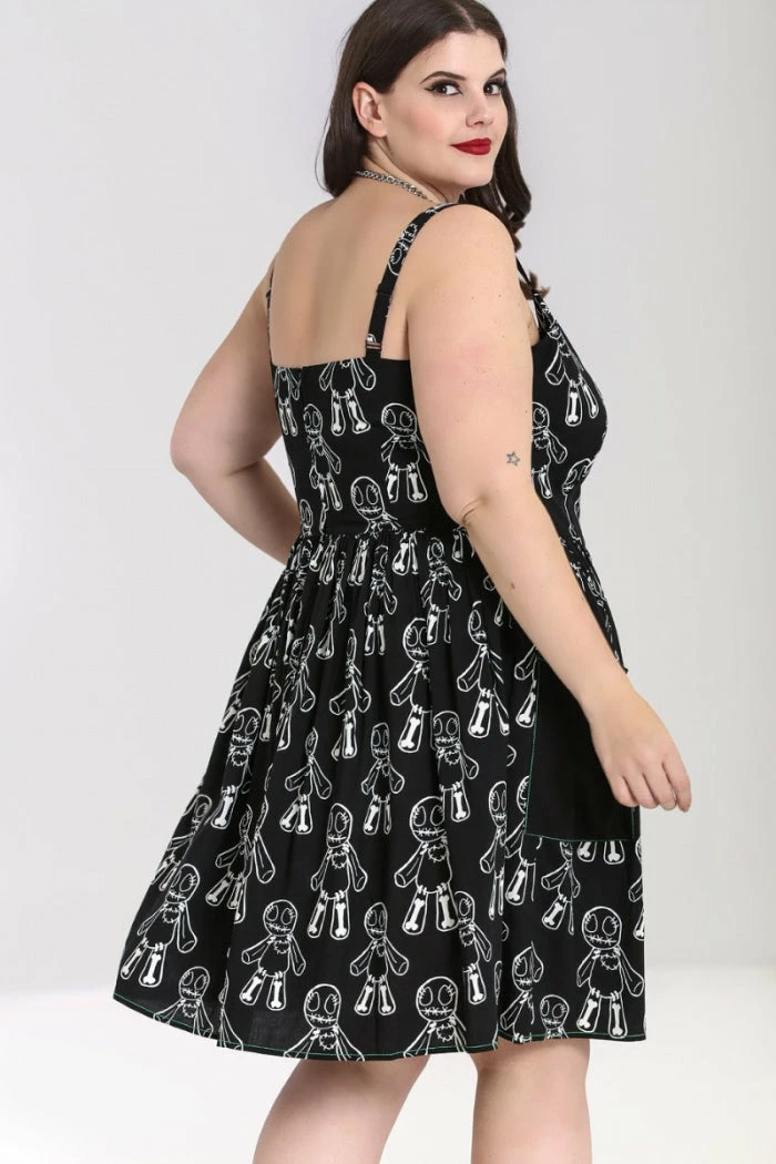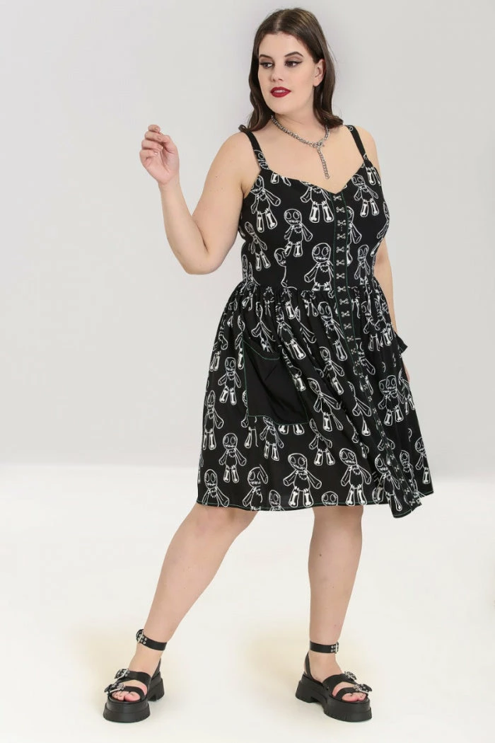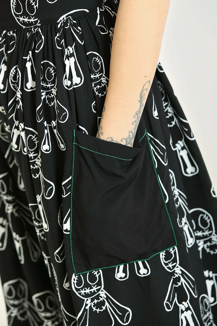 Stunning black midi dress with white contrast voodoo doll print from Hell Bunny. This awesome monochrome sleeveless dress features green contrast stitching and hook and eye detailing down the length of the front and fastens with a back zip. This lovely dress has adjustable spaghetti straps, is fitted at the waist and then flares out. It looks great dressed up or down and has 2 large front pockets!