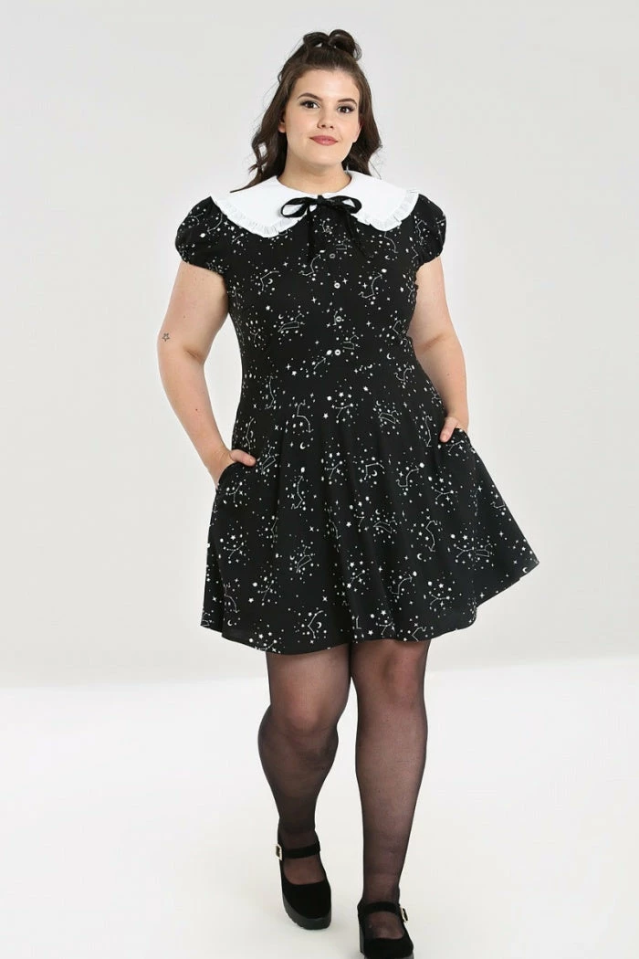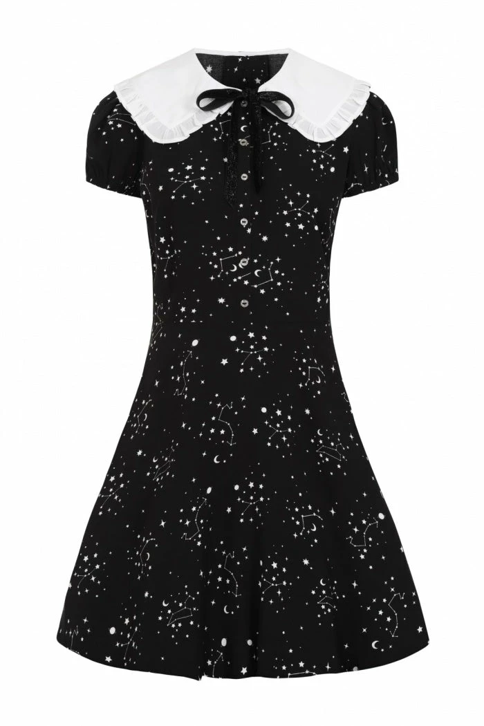 Stand-out black mini dress with white contrast celestial star print from Hell Bunny. This awesome monochrome dress features frills on the short cap sleeves, statement large white contrast collar with a removeable black glitter tie. This lovely dress is fitted at the waist and then flares out with convenient pockets in the side seams. It has a button up front and back zip fastening and looks great dressed up or down!