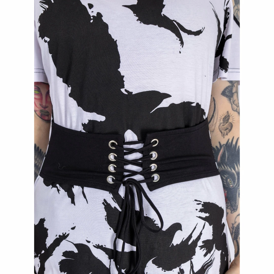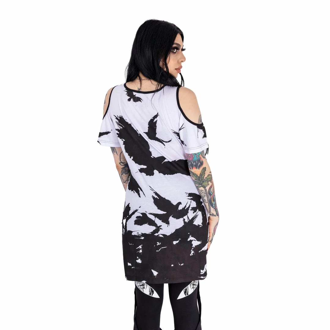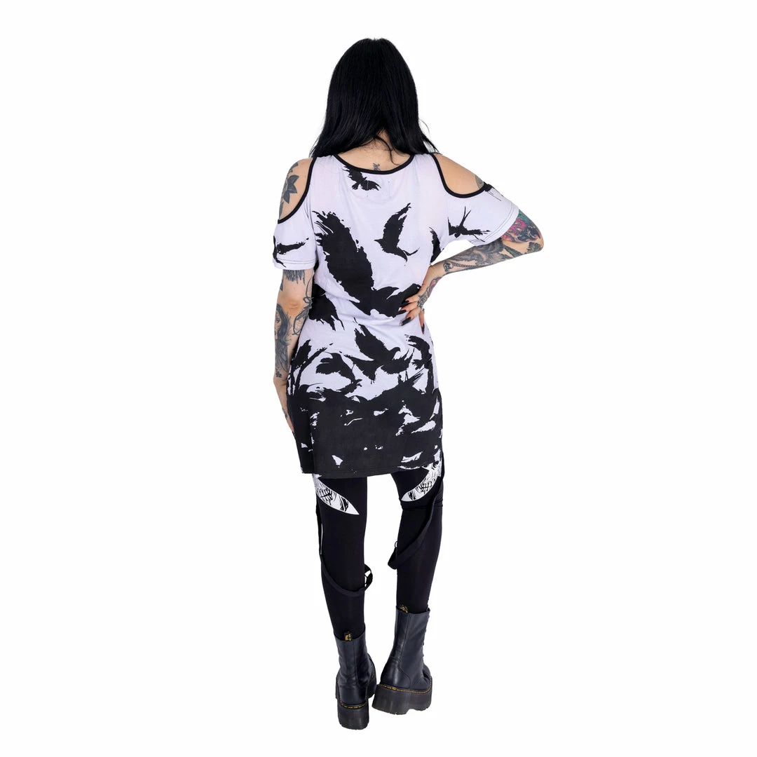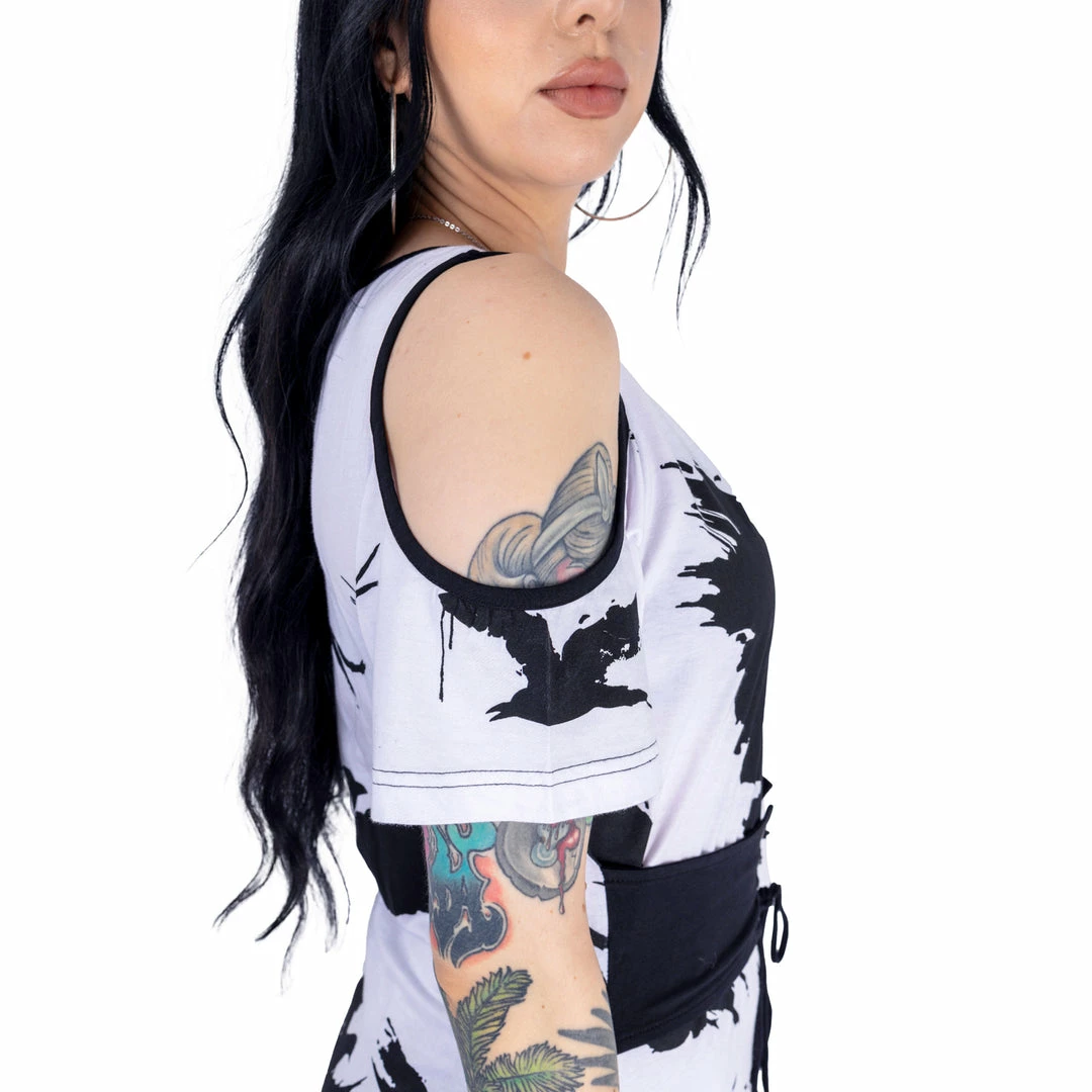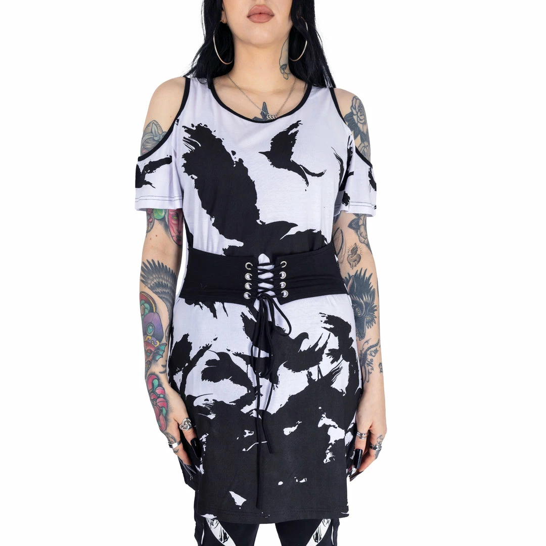 Unique and stylish longline short-sleeve shirt from Innocent with cold shoulders. This must-have black and white top features a stunning crow image print . Made from a soft cotton fabric with a loose relaxed fit that can be fitted to your style with adjustable lace up front belt panel. Looks awesome paired with leggings and chunky boots or your favourite heels!