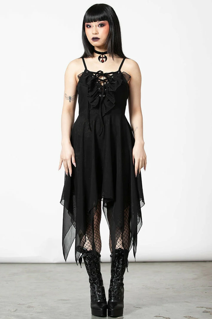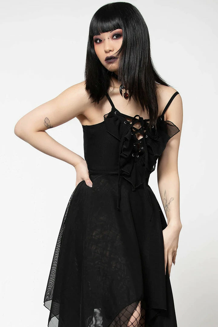 Showstopping black dress from Killstar! This stunning midi dress is made from a luxury soft stretchy fabric that is fitted to accentuate your figure with a lined upper bodice with stunning lace up front. This amazing black party dress features adjustable shoulder straps and a layered mesh skirt with hanky hem. Beautiful and glamorous, this dress has a nipped in waist and flowing style skirt.