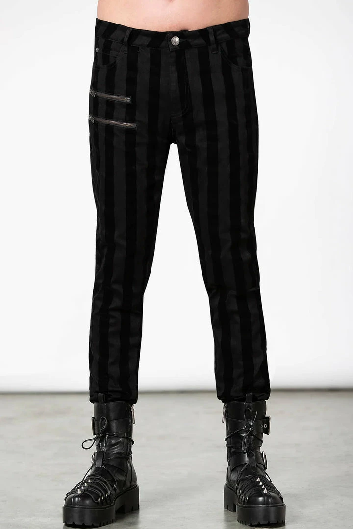 Stylish and versatile black trousers from Killstar! These awesome black trousers are fitted with pockets, belt loops and button and zip closure. Made from a soft black stripe flocked denim fabric with zip detailing and easy to dress up or down according to your mood!