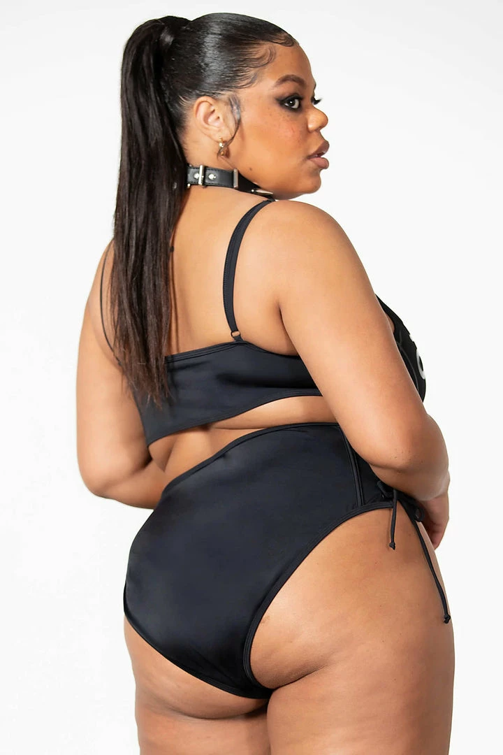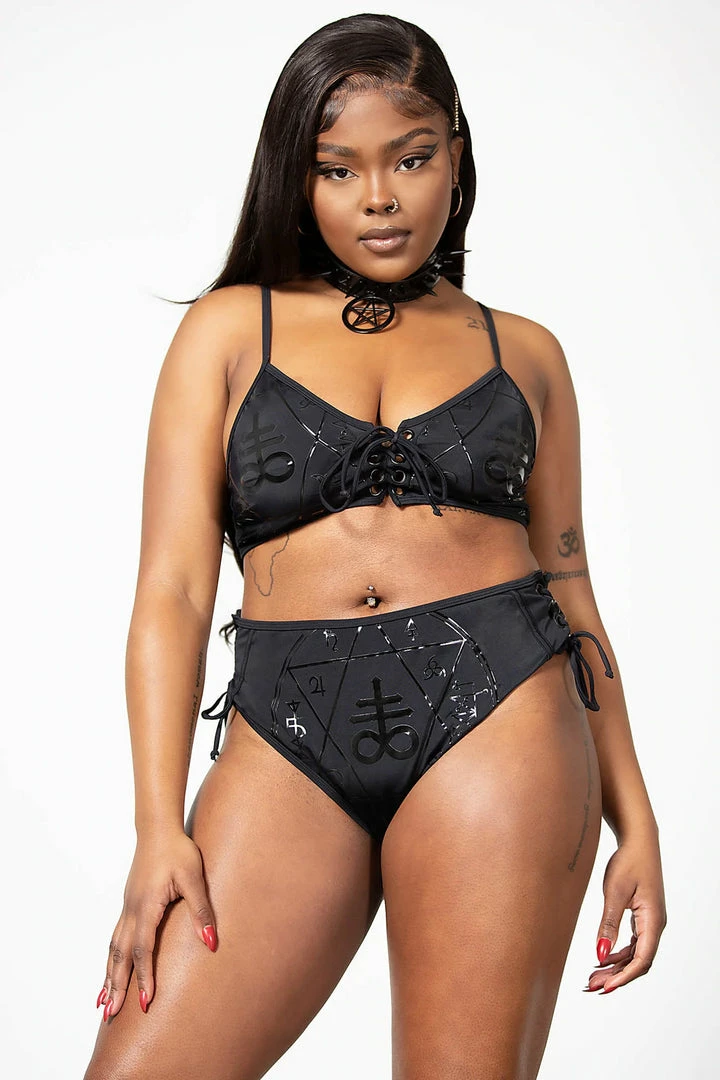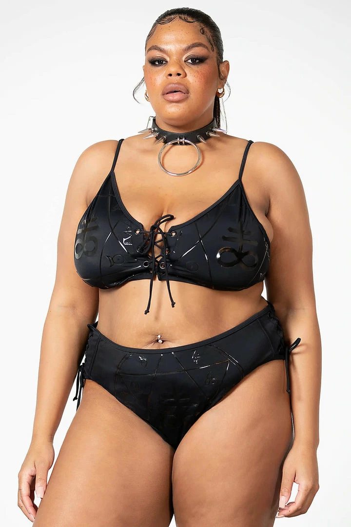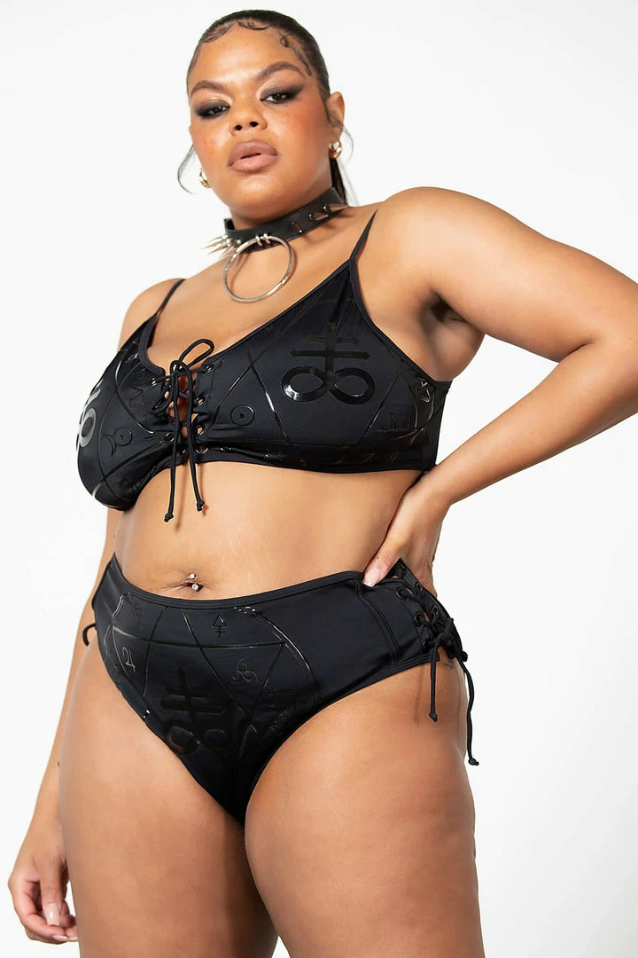 Gorgeous two piece black swimsuit from Killstar that is as hot as hell! This stunning black bikini is a gothic dream with a statement lace up corset design with black on black print! This head turning swimwear is made from a soft nylon blend fabric with non padded cups, adjustable straps and side tie bottoms!