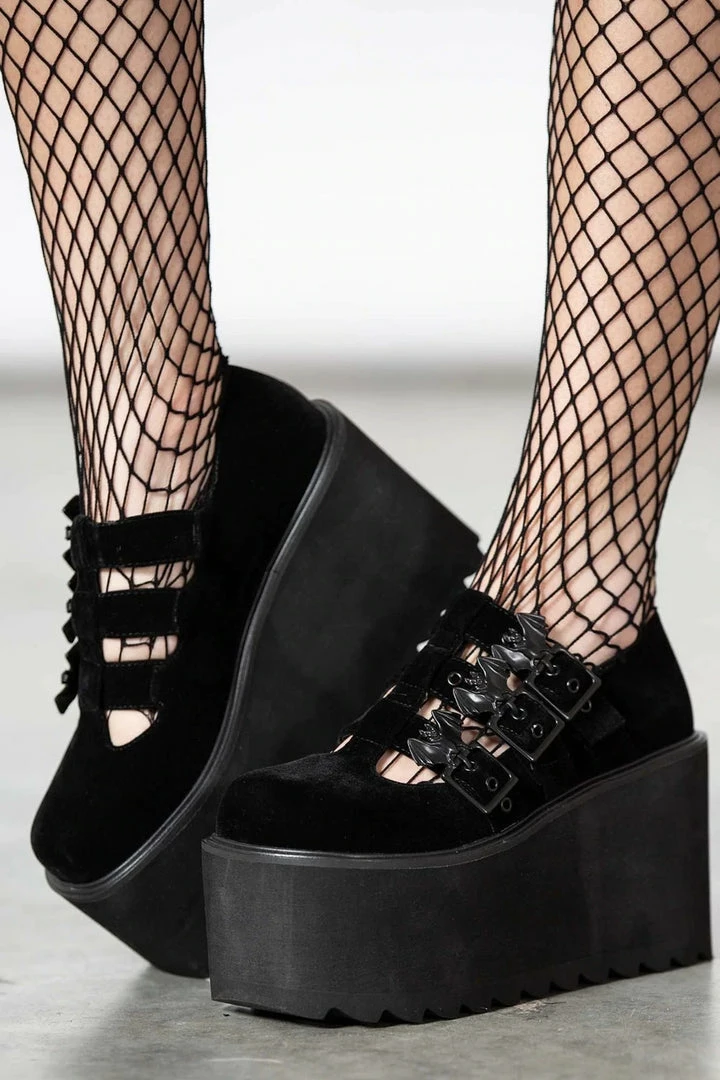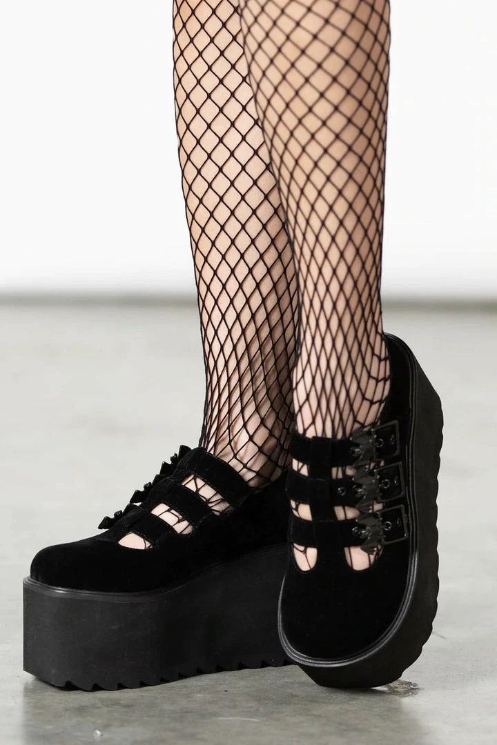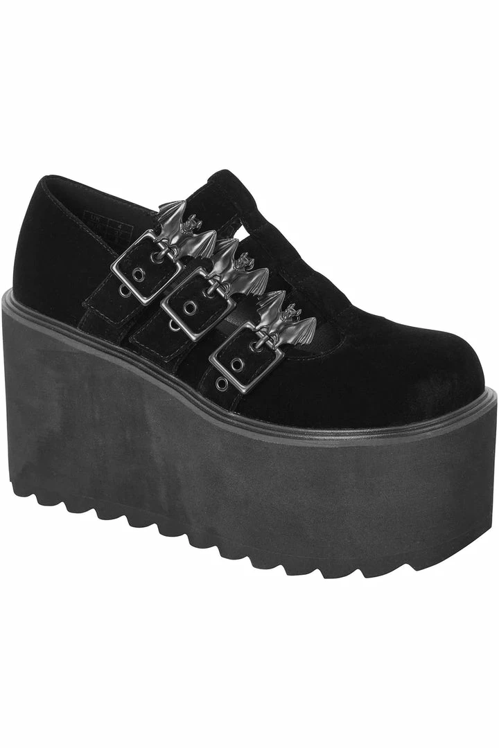 - The Killstar Evil Mary Janes come with a secure buckle strap and a chunky heel, providing a perfect balance of comfort and style. The platform sole adds height and a bold statement to your look.