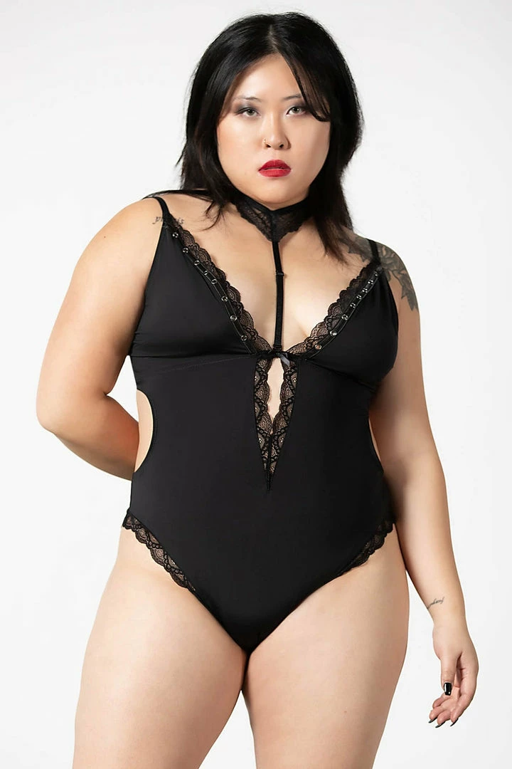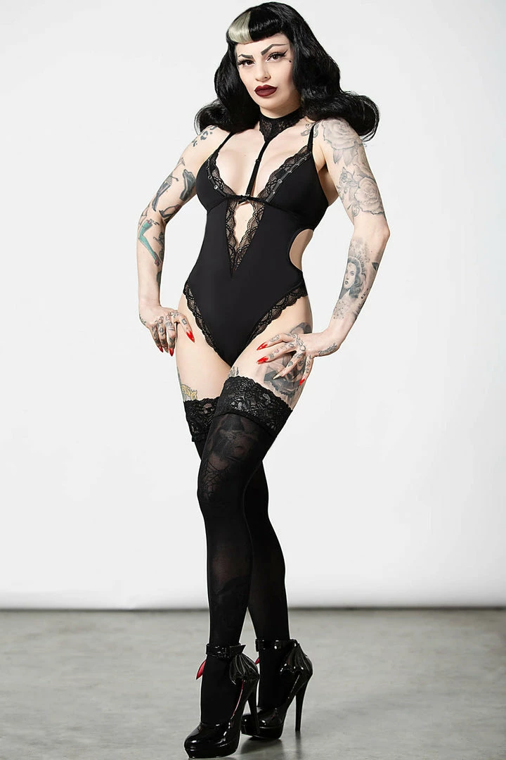 Enchanting black bodysuit from Killstar that is made from luxury stretch fabric with lace trims with a body-hugging fit that will show off your figure. This seductive black bodysuit brings extra drama with detachable lace choker, metal rivet details, adjustable straps and hook and eye closure!