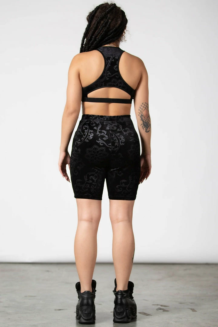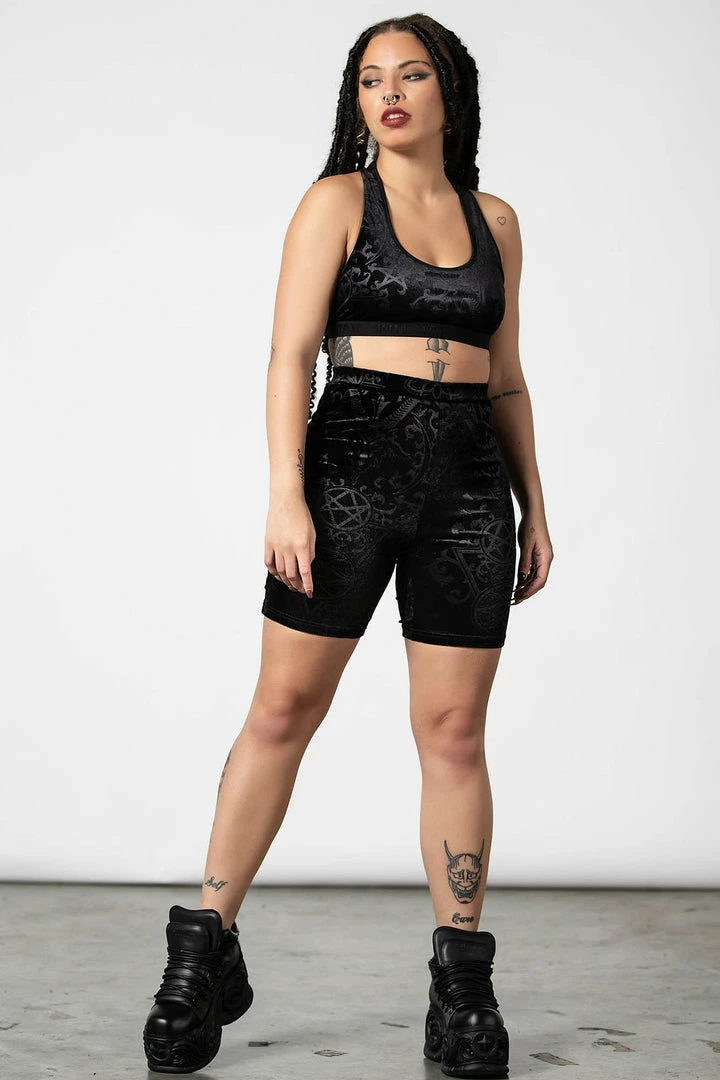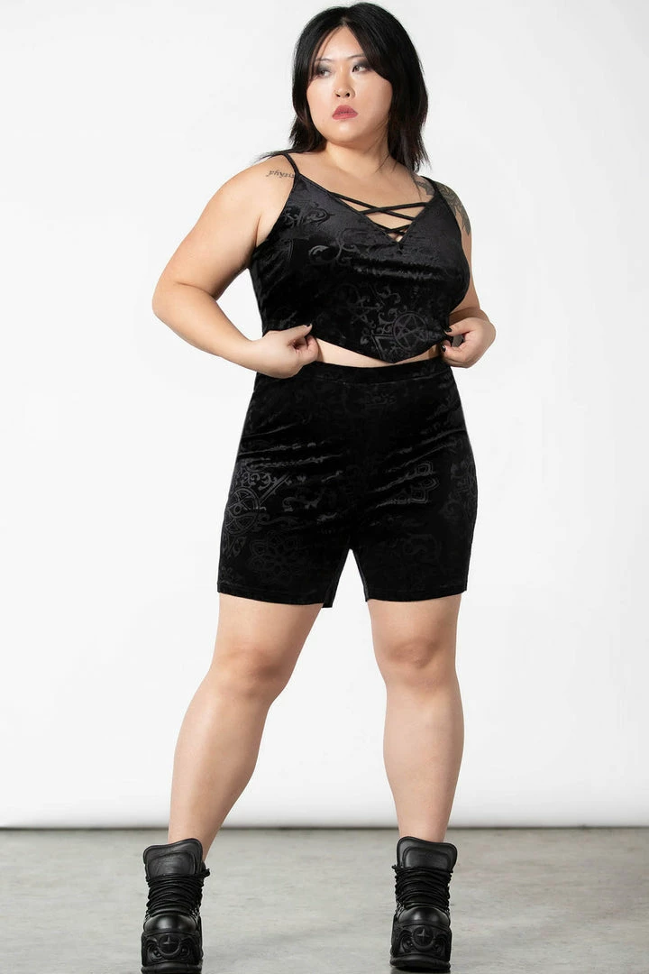 - Enhance your wardrobe with the Killstar Misfortune Velvet Cycle Shorts, designed for the modern gothic lady. These plus size shorts combine style and comfort effortlessly.