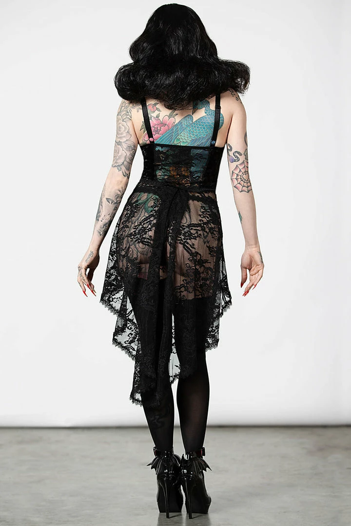 Stunning black basque from Killstar that is made from a soft stretch lace fabric with velvet panels for a fit that is both seductive and powerful with velvet cups and detachable bustle! This exquisite basque features adjustable straps with front lace up corset closure and looks amazing on! Don’t forget to buy the Killstar Be Veiled Lace Panty for the complete set! Oh la la!
