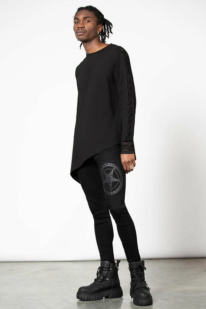 - Crafted with high-quality materials, the Thaddeus Asymmetric Top ensures comfort and durability. Its intricate detailing and dark aesthetic make it perfect for any gothic or alternative style enthusiast.