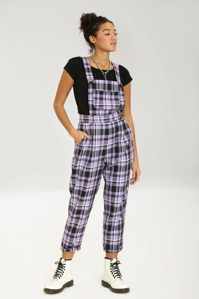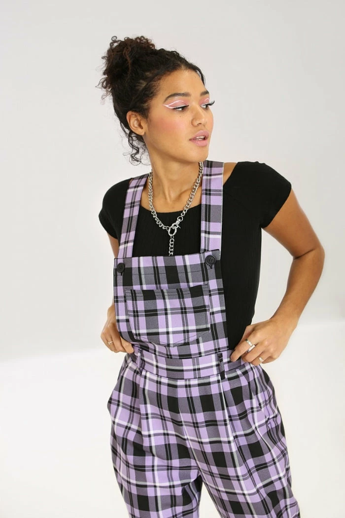 - Step into timeless style with the Ladies Hell Bunny Lavender Alicia Dungarees. These plus size trousers feature a vintage-inspired design that combines elegance and comfort.
