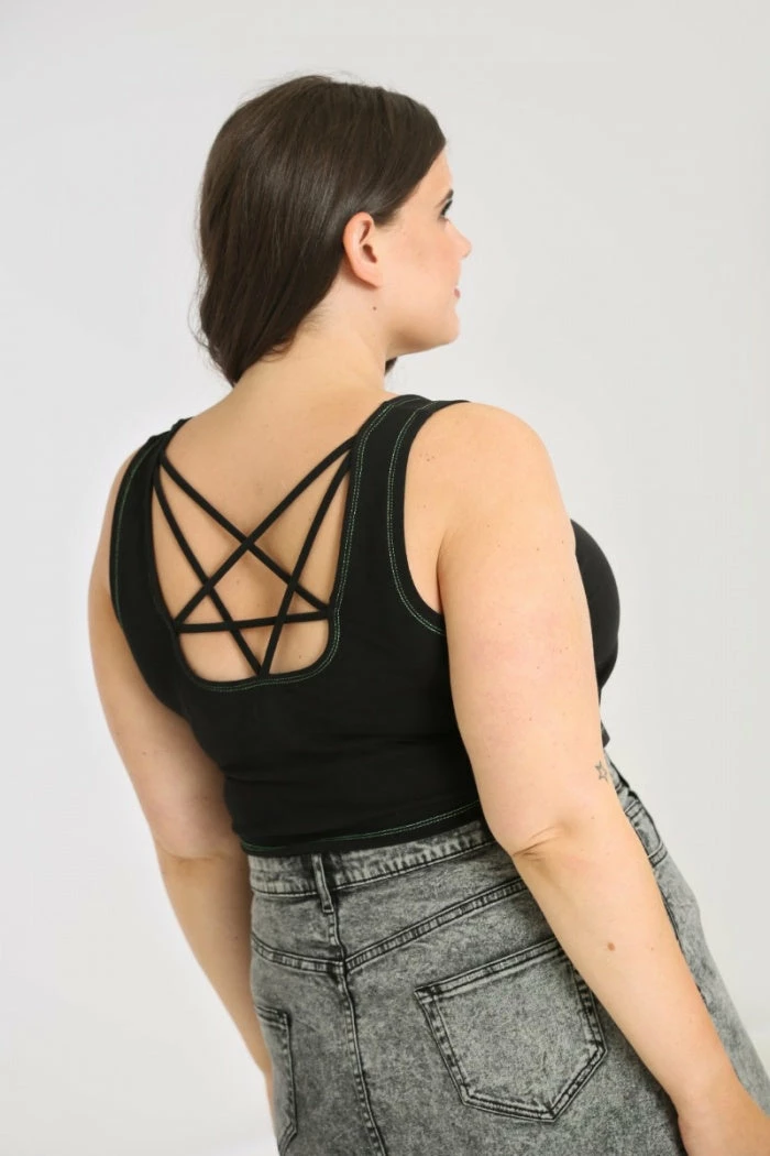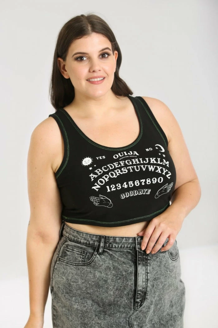 Amazing must-have black loungewear crop top from Hell Bunny. The Ouija crop top features a white contrast ouija symbols and contrasting neon green stitching! Perfect for lounging, this fitted top is made from a super soft and cosy cotton jersey and also features a low back with pentagram crisscross strap detailing. Match perfectly with the Ouija Joggers!