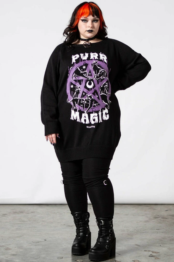- Enhance your gothic wardrobe with the Ladies Killstar Purr Magic Knit Sweater. This unique piece combines a cozy knit design with mystical purr motifs, perfect for any occult enthusiast.