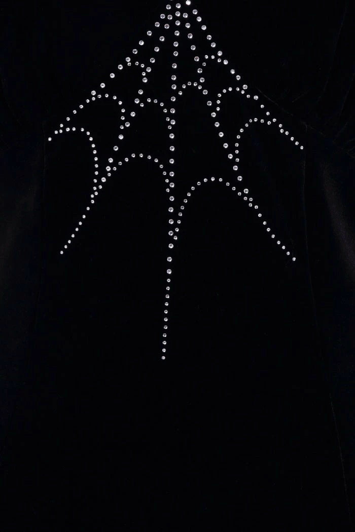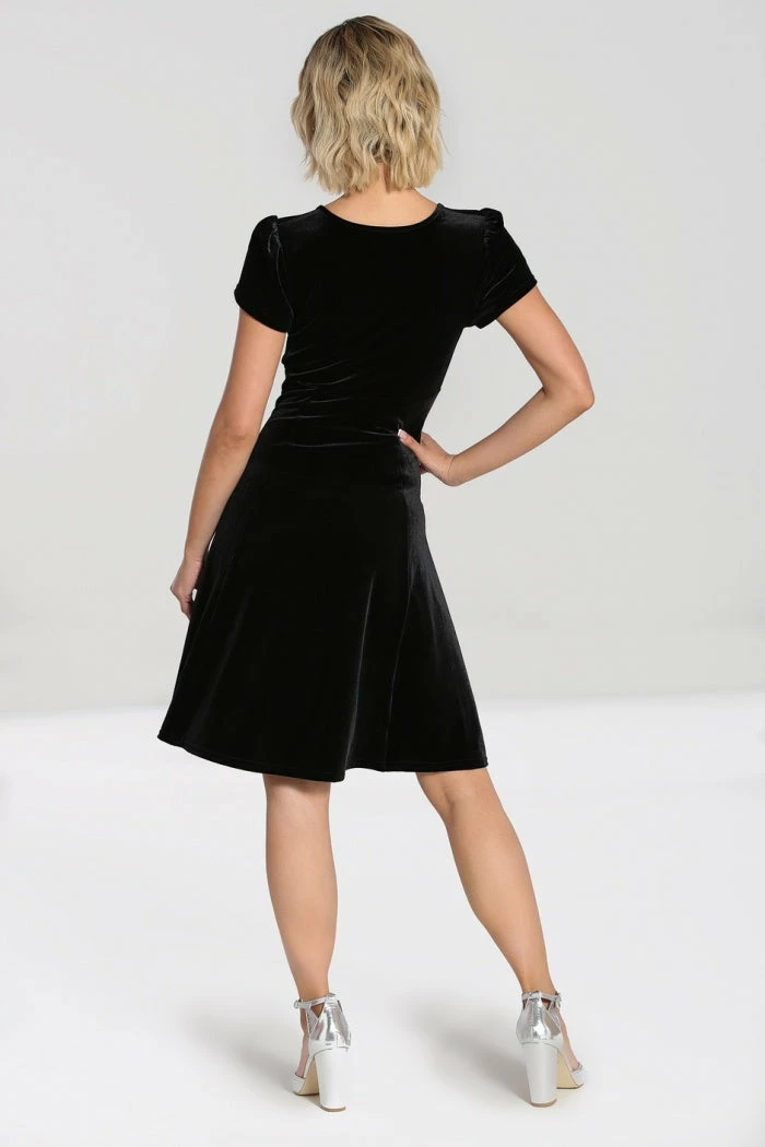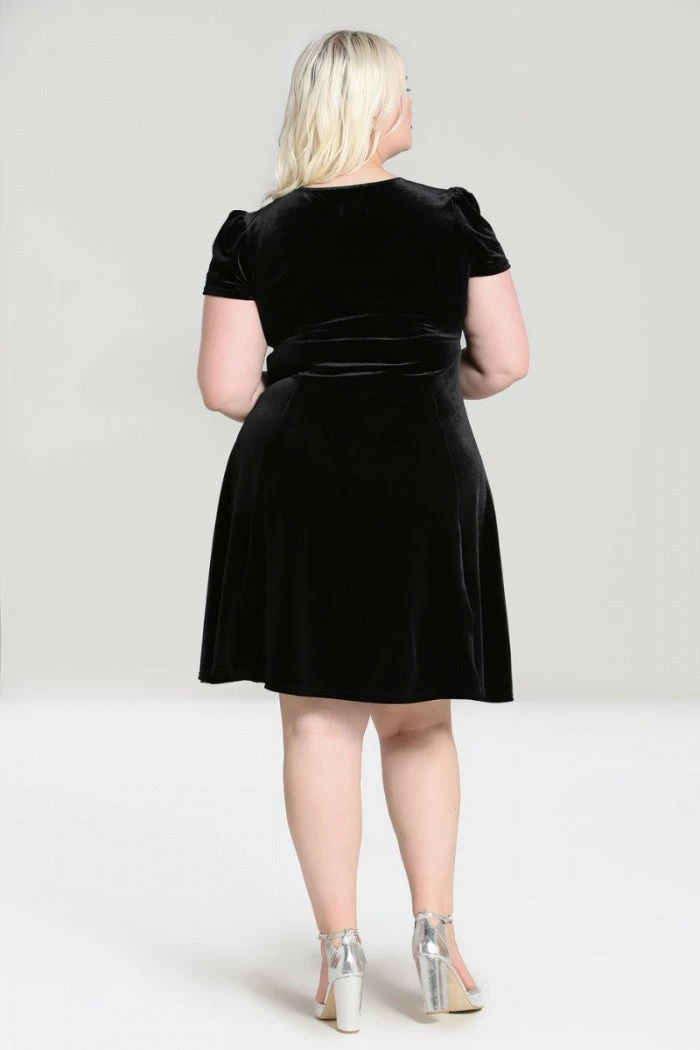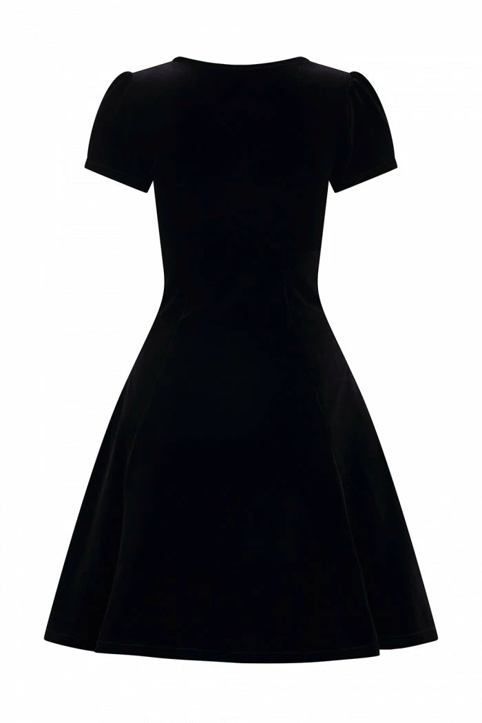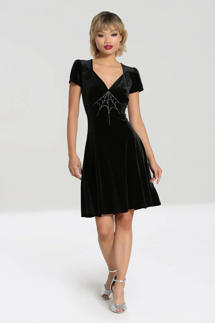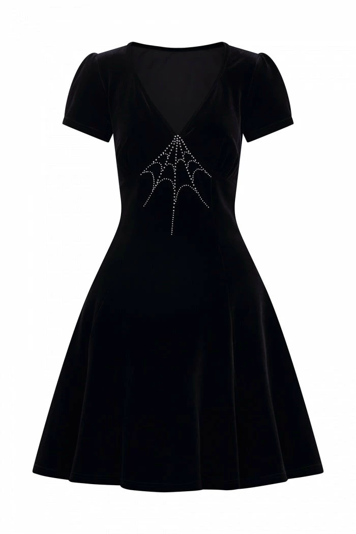 Gorgeous black velvet midi dress with crystal spiderweb detailing on the bodice from Hell Bunny. This awesome mid length party dress features short puff sleeves, sweetheart neckline with lace up detailing and fastens with a back zip. This lovely dress is made from a soft stretch velvet fabric, is fitted at the waist and then flares out. It looks amazing for a night out!
