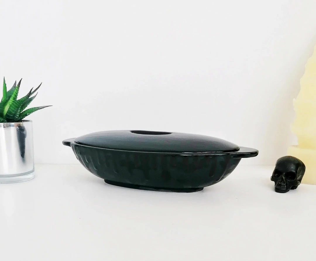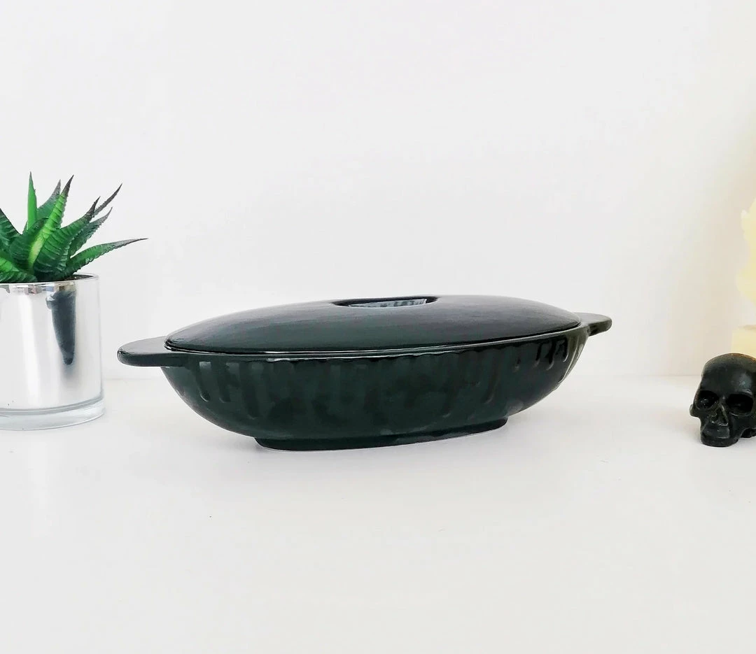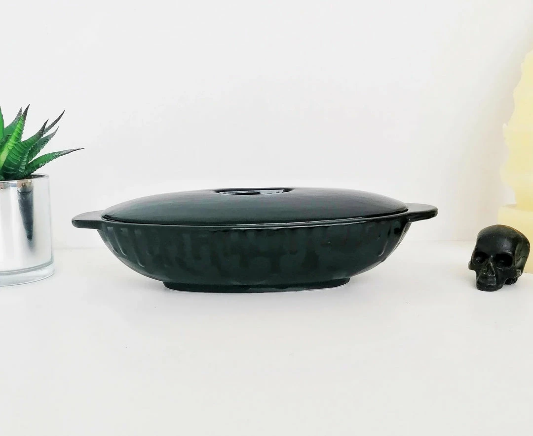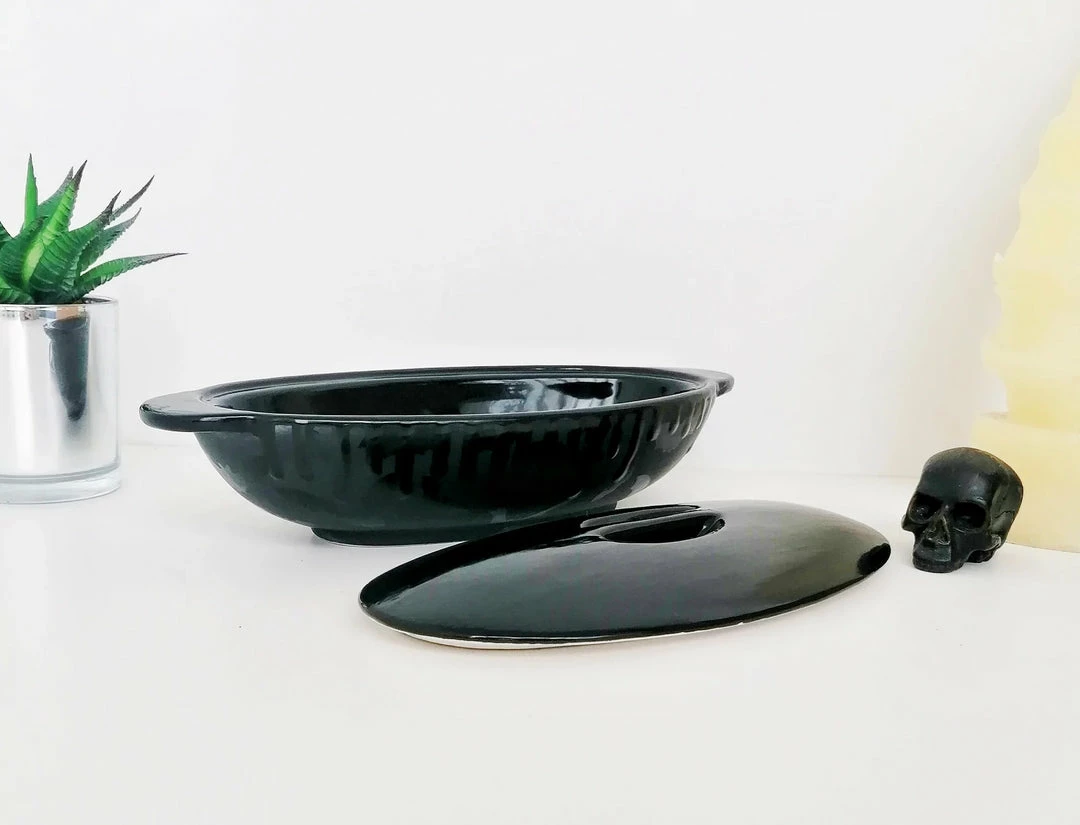 - Elevate your dining experience with the Matte Black Bat Oval Service Platter With Lid from Weird & Wonderful Ceramics. Perfect for serving and storing your favorite dishes in style.
