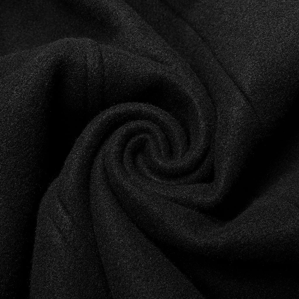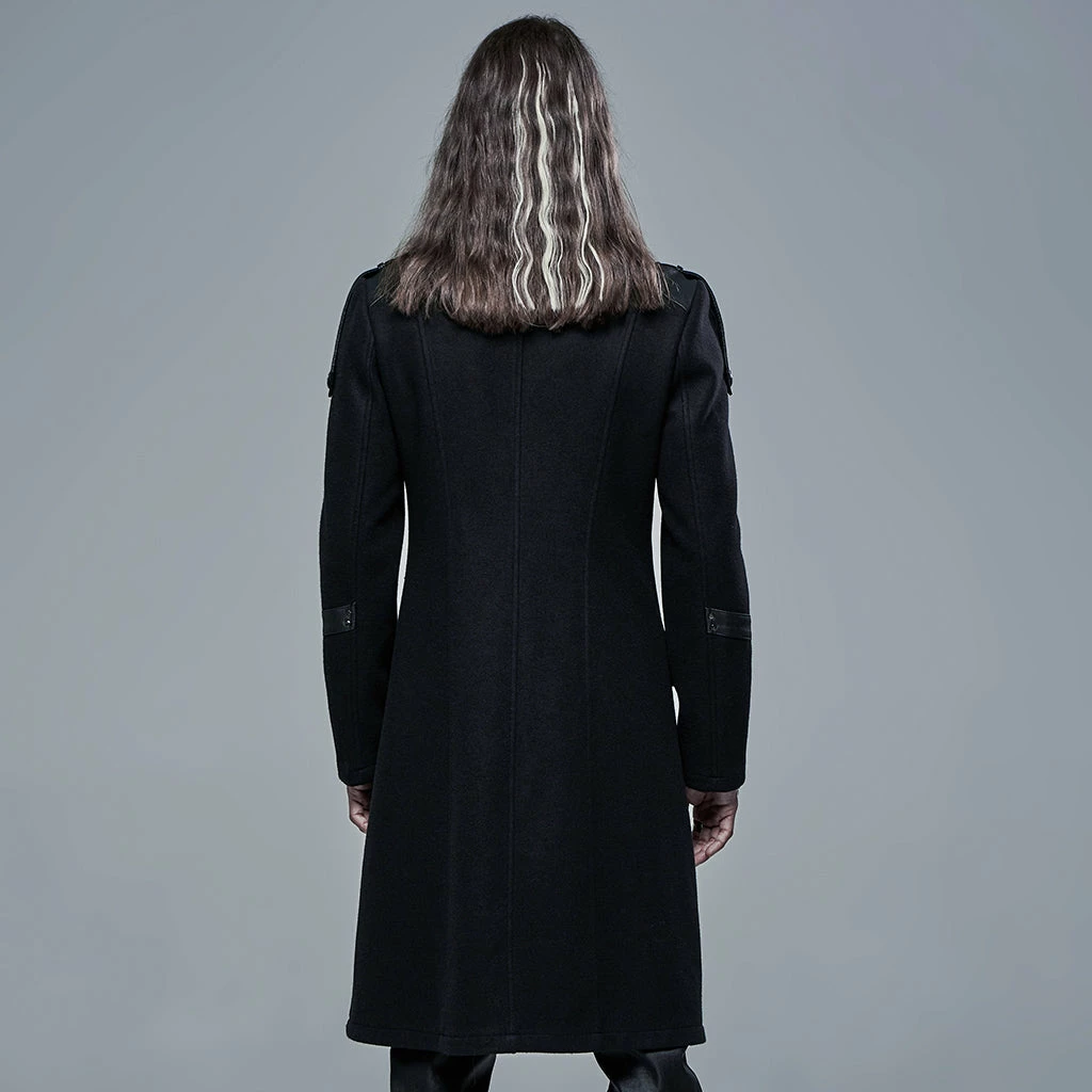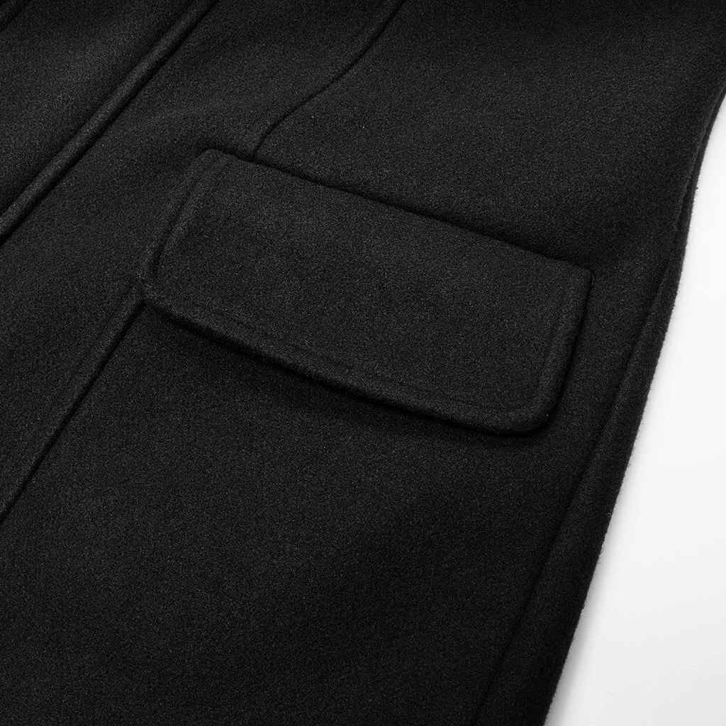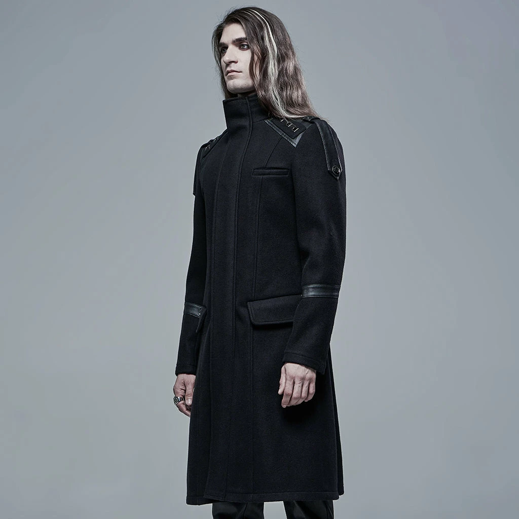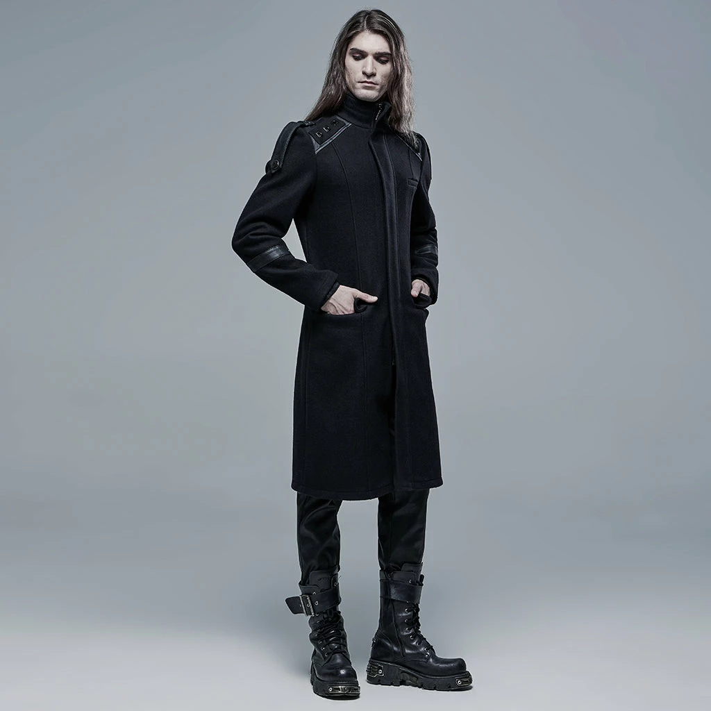 Say hello to this chilly weather with the Punk Rave Colburn Long Coat. This wool effect lightweight coat features a full length hidden zip at the front, two large hooded pockets, and rounded high collar. With imitation leather detailing on the shoulders and sleeves, this simple yet stylish coat will keep you covered.