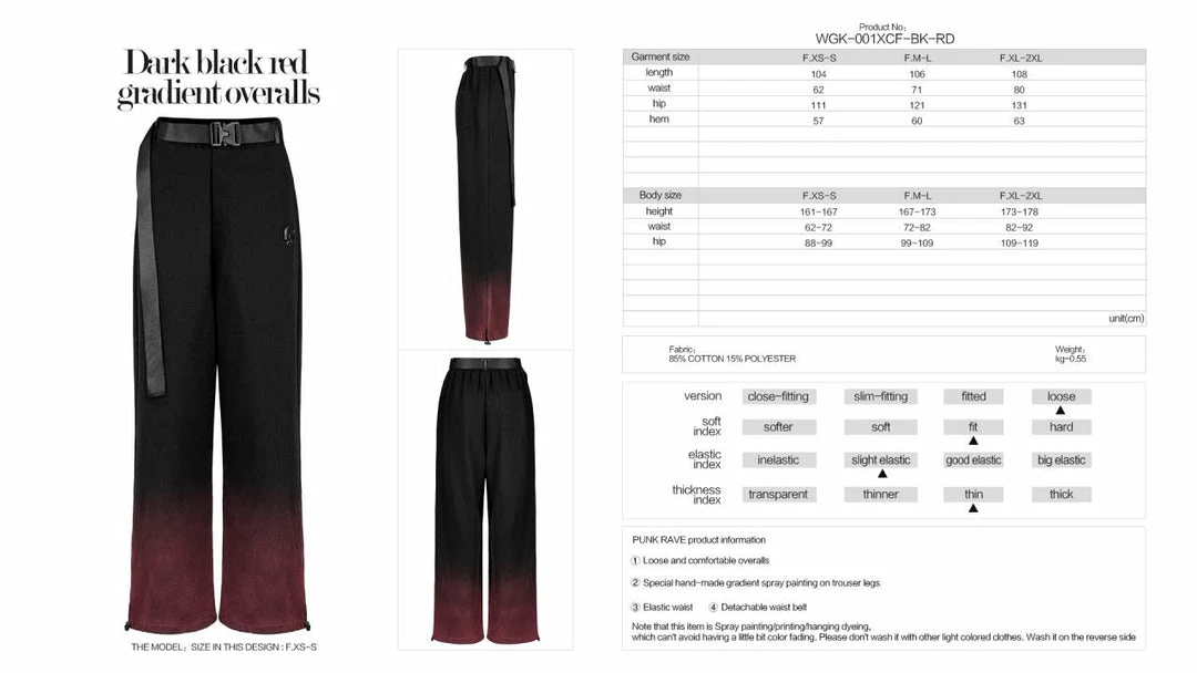 - The Punk Rave Fade To Red Trousers are versatile and can be paired with various tops and accessories to create a unique look. Ideal for concerts, parties, or everyday wear.