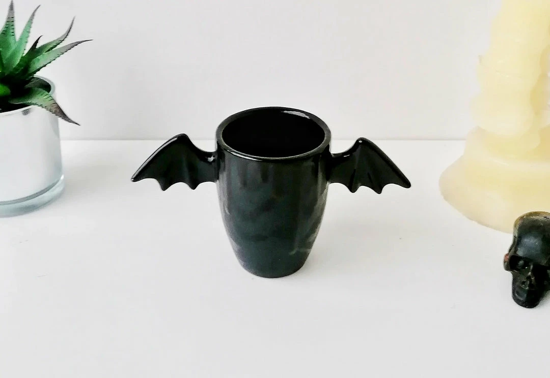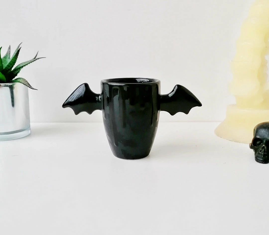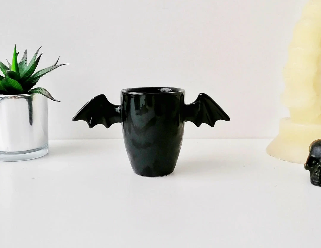 - Add a touch of whimsy to your morning routine with the Weird & Wonderful Matte Black Bat Wing Ceramic Mug. Its unique bat wing design is sure to stand out in your kitchen.